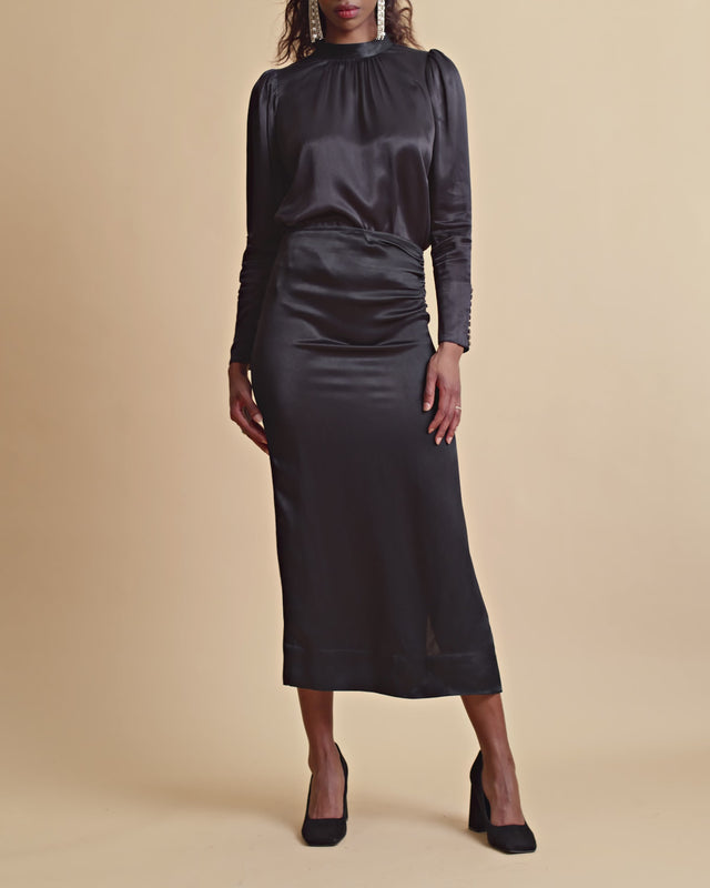 The Crepe Satin Skirt, crafted from lustrous FSC certified viscose, effortlessly blends glamour with sustainability. The sumptuous, heavy fabric offers a luxurious silk-like feel. This skirt boasts a fitted silhouette and midi length for a sophisticated touch.